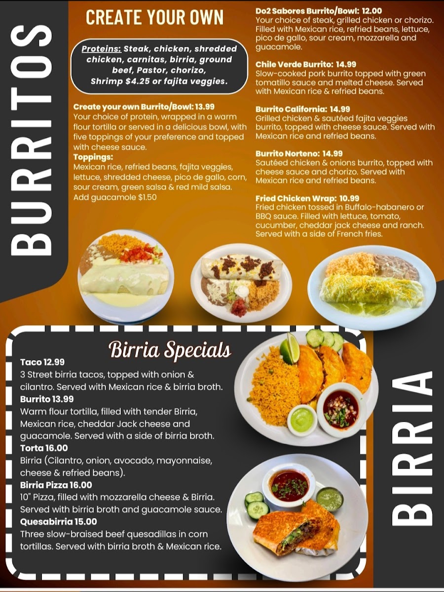 The variety on offer encourages sharing and savoring, with items like chicken and steak memelas or the popular Birria tacos inviting you to explore bold yet familiar tastes. For those who appreciate customization, the create-your-own burrito option lets you tailor your meal with a choice of proteins and toppings, making each visit feel comfortably personal.